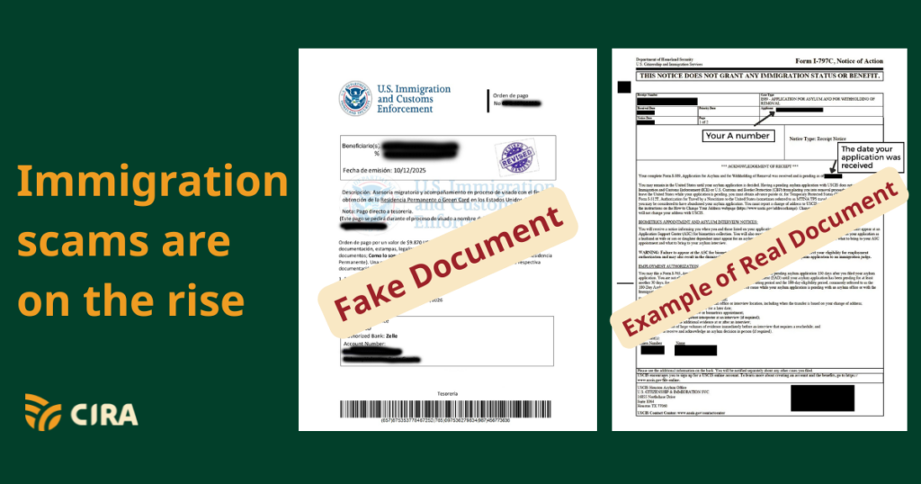 “These scams have led to individuals losing thousands of dollars, resources, and hope,” said CIRA Legal Director Roxana Cortes-Mills. “Immigration processes are complex, which makes it easier for misinformation and scams to spread. The best protection is accurate information and working with licensed attorneys or accredited representatives.”