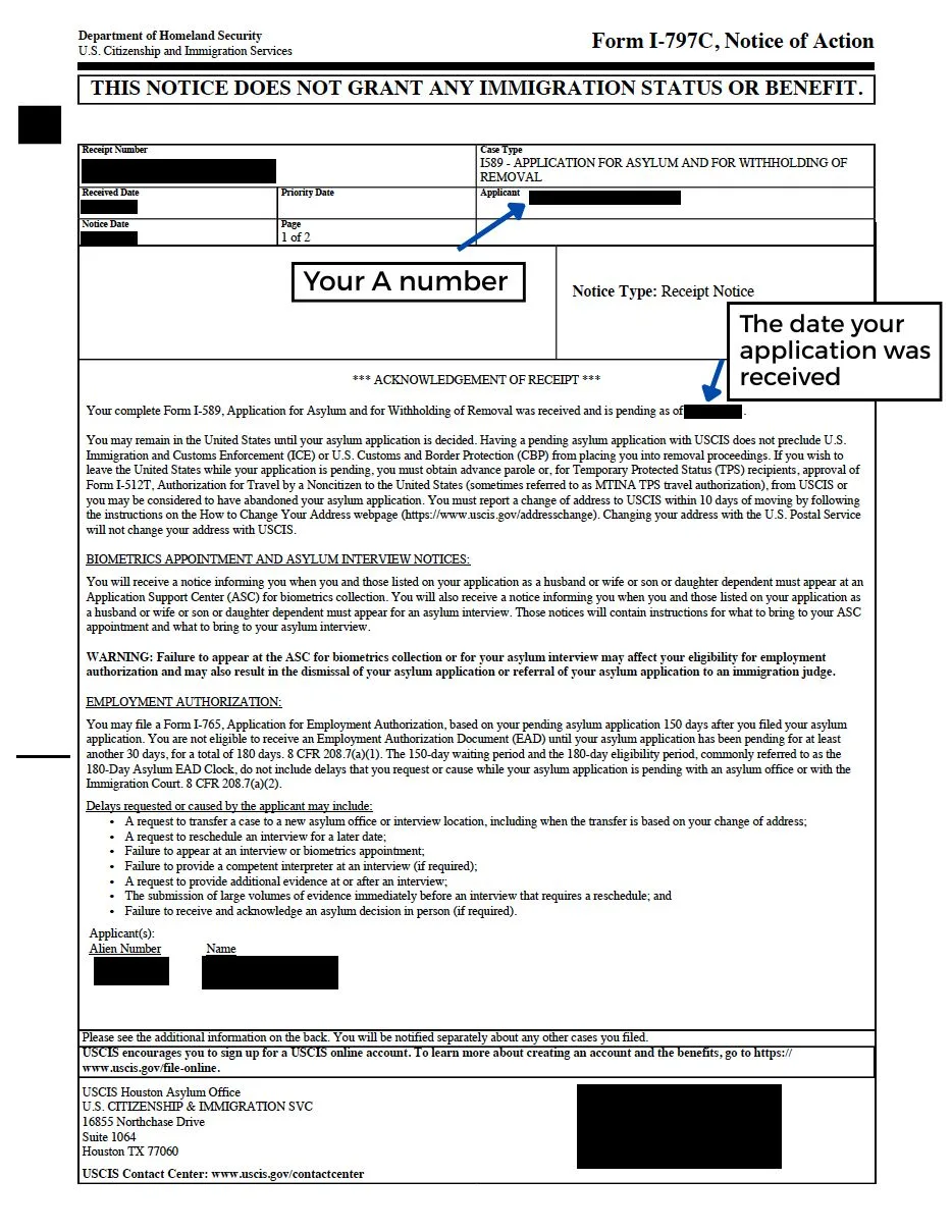 This is an example of a real USCIS Asylum Application Receipt Notice provided by the Asylum Seeker Advocacy Project (ASAP). Other sample documents can be found on the ASAP website. It is important to note this is a sample. Some people may not receive a document that looks like this, but it could still be legitimate.